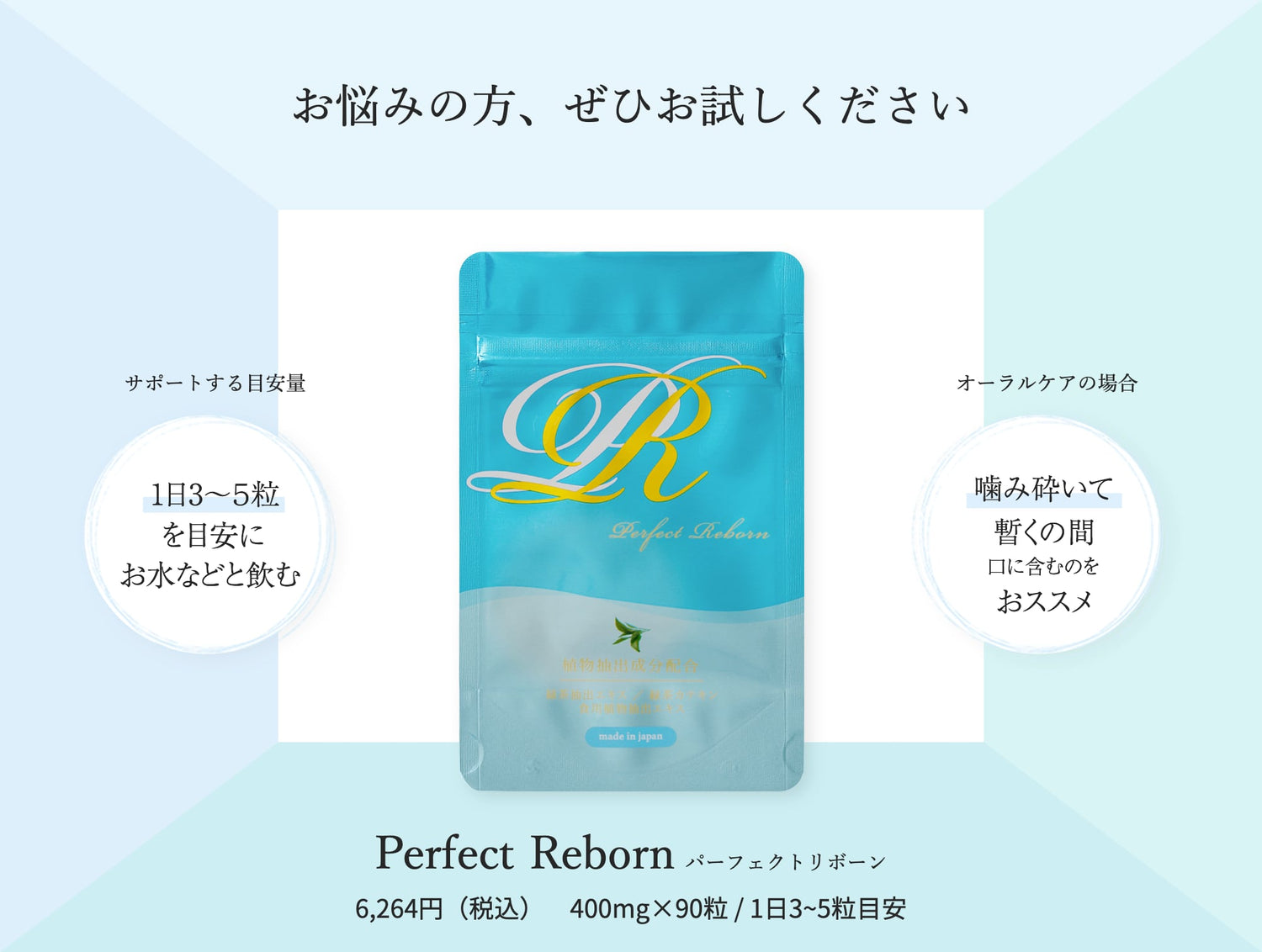 毎日の生活においてニオイは気になるものです。ニオイによっては不快な気持ちになることもあると思います。そんな中、誕生した「Perfect Reborn / パーフェクトリボーン」カラダの中からニオイのトータルケアをします。今までニオイに悩んでいた方に対して少しでもお力になれればと思い開発しました。